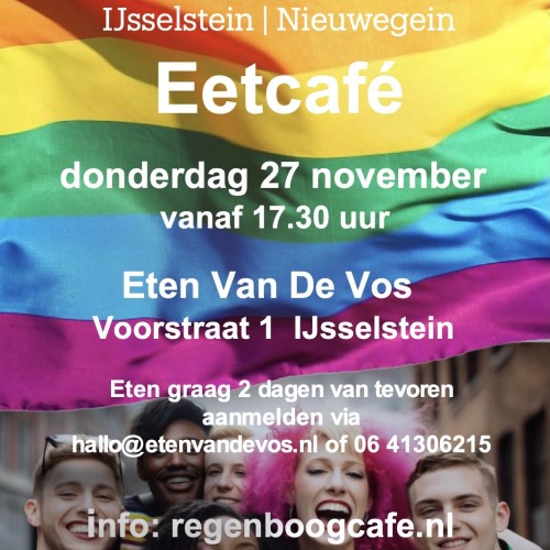 Eet mee met Regenboogcafé IJsselstein Nieuwegein Kom donderdag 27 november ook eten bij Eten Van De Vos, Voorstraat 1, 3401…