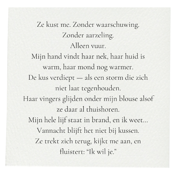 Ik vraag Harper hoe het met haar eigen queer levensweg zit, ze vertelt: 'Ik was 17 toen ik uit de kast kwam en dat is ondertussen 30 jaar geleden. In het midden van de jaren 90 in België was het allesbehalve 'trendy' om queer te zijn maar je voelde toch dat er verandering in de lucht hing. We hadden holebi-jongerengroepen, grote Pride parades en minstens één queer party per maand. Als ik me ooit anders voelde, was het nooit omdat ik een lesbienne was. Ik heb nooit iets anders willen schrijven dan liefdesverhalen tussen vrouwen. Het is simpelweg nooit bij me opgekomen.'