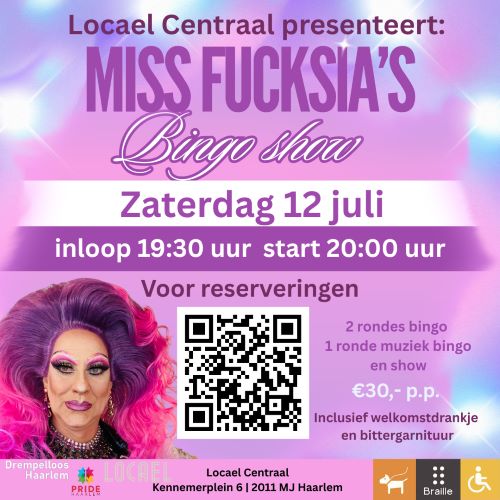 Reserveer nu een plekje bij de Bingo Show van Miss Fucksia voor een avond vol plezier en entertainment. 3 rondes bingo inclusief show, welkomstdrankje en bittergarnituur.
