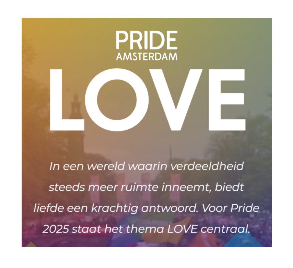 Het thema voor Amsterdam Pride 2025 is LOVE: 'In een wereld waarin verdeeldheid steeds meer ruimte inneemt, biedt liefde een krachtig antwoord. Voor Pride 2025 staat het thema LOVE centraal, niet alleen als symbool van romantiek, maar ook als fundament voor verbinding, begrip en solidariteit. Liefde boeit, bindt, steunt en overwint.'