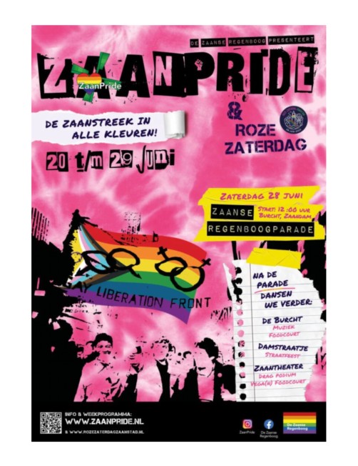 In Zaanstad vier je dit jaar Pride én Roze Zaterdag. Het thema is 'de Zaanstreek in alle kleuren.' De hele week zijn er verschillende activiteiten, zoals filmmiddagen, borrels en bingo's. Met als hoogtepunt Roze Zaterdag, op 28 juni, die dit jaar in Zaanstad plaatsvindt. De dag begint met de Zaanpride: een feestelijke, maar ook demonstratieve tocht. Daarna bezoek je het Zaantheater, dans je bij Karin Bloemen of ga je los bij Walter Kroes. Bekijk het programma via dezaanseregenboog.nl