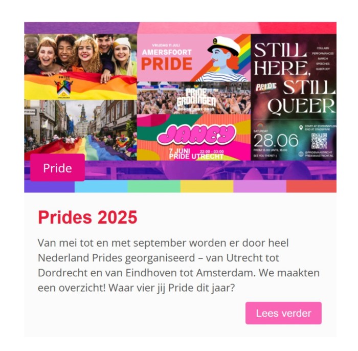 'Een dag vol verbinding, zichtbaarheid en inclusiviteit voor de queer-gemeenschap en de diversiteit: Verwacht spectaculaire optredens, een feestelijke parade, informatiemarkten, theater, cabaret, sport en nog veel meer!'