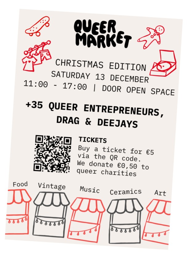 Op 13 december is er ook een Queer Market Christmas Edition. In Amsterdam-Noord vind je een warme, inclusieve kerstmarkt waar queer en lokale ondernemers hun creativiteit tonen, van kunst en kleding tot food, design en cadeaus met een verhaal. Hier lees je meer!