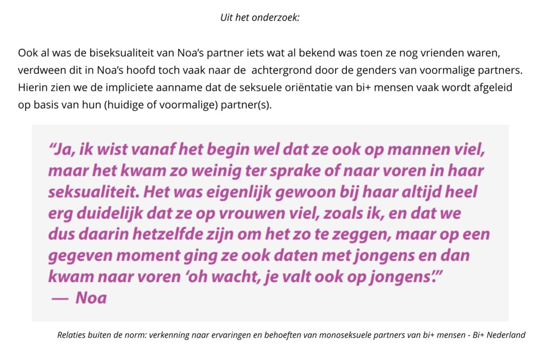 Op de website van Bi+ Nederland lees je meer en vind je de complete verkenning; die bestaat uit een literatuurstudie, bevindingen uit interviews met monoseksuele partners van bi+ mensen, met daarbij ook voorbeelden van uitspraken, en eindigt met conclusies en aanbevelingen.